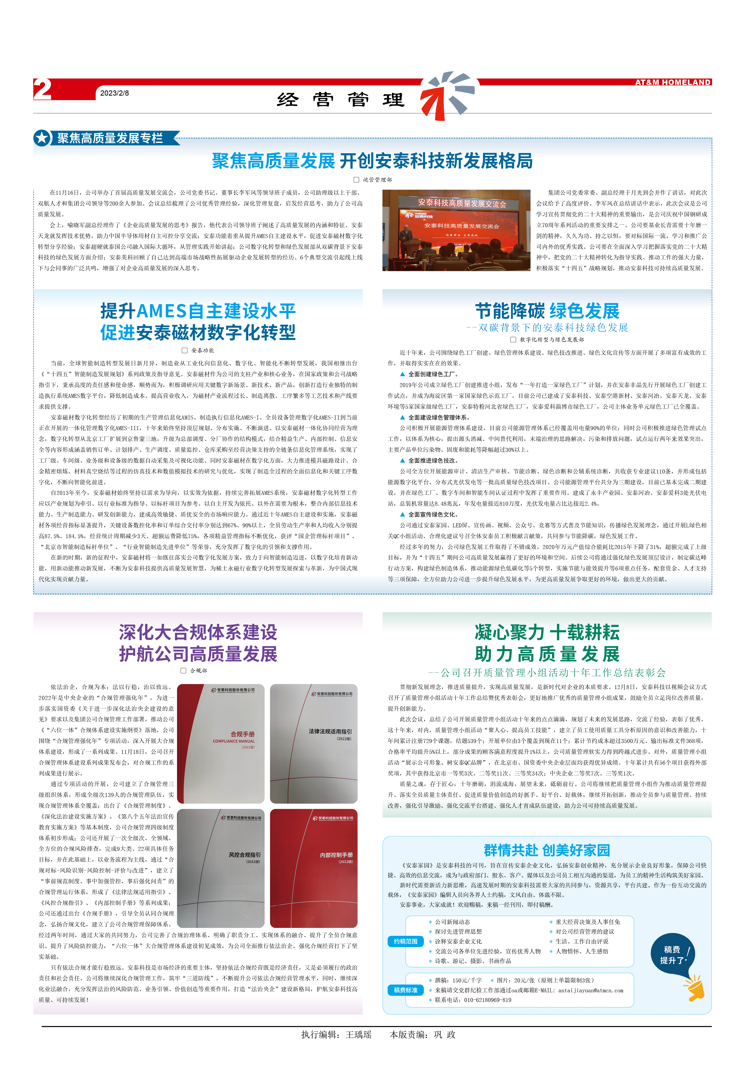 會(huì)上,喻曉軍副總經(jīng)理作了《企業(yè)高質(zhì)量發(fā)展的思考》報(bào)告,他代表公司領(lǐng)導(dǎo)班子闡述了高質(zhì)量發(fā)展的內(nèi)涵和特征。安泰天龍就發(fā)揮技術(shù)優(yōu)勢(shì),助力中國(guó)半導(dǎo)體用材自主可控分享交流;安泰功能著重從提升AMES自主建設(shè)水平,促進(jìn)安泰磁材數(shù)字化轉(zhuǎn)型分享經(jīng)驗(yàn);安泰超硬就泰國(guó)公司融入國(guó)際大循環(huán),從管理實(shí)踐開始講起;公司數(shù)字化轉(zhuǎn)型和綠色發(fā)展部從雙碳背景下安泰科技的綠色發(fā)展方面介紹;安泰美科回顧了自己達(dá)到高端市場(chǎng)戰(zhàn)略性拓展驅(qū)動(dòng)企業(yè)發(fā)展轉(zhuǎn)型的經(jīng)歷。6個(gè)典型交流引起線上線下與會(huì)同事的廣泛共鳴,增強(qiáng)了對(duì)企業(yè)高質(zhì)量發(fā)展的深入思考。